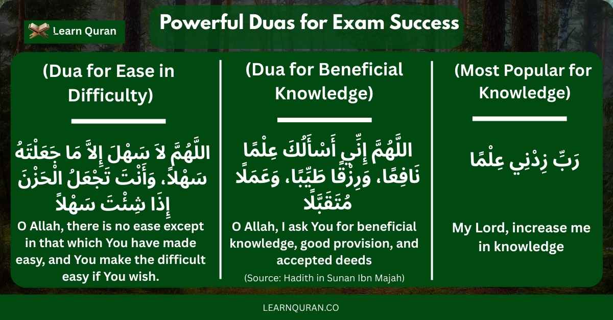 Powerful dua for exam success includes inni requesting teach me knowledge that's righteous. Musa's prayer to remove the impediment helps expression.Dua for exam success builds confidence. May understand what i say during answers.Beneficial knowledge sticks better. Merciful response from allah.